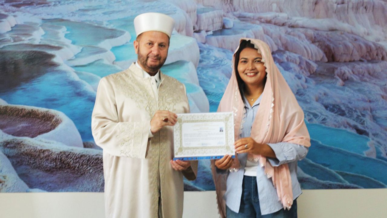 پاموكاله إیلچه موفتولوگونده ترتيپ ايديلن إیهتيده مراسيمينده كلمە-ي شهادت كتيرە رك موسلومان اولان اپينيه چوك موتلی اولدیگونی و اقان ياشلارين موتلولق كوز ياشي اولدیگونی إیفاده ايتي.