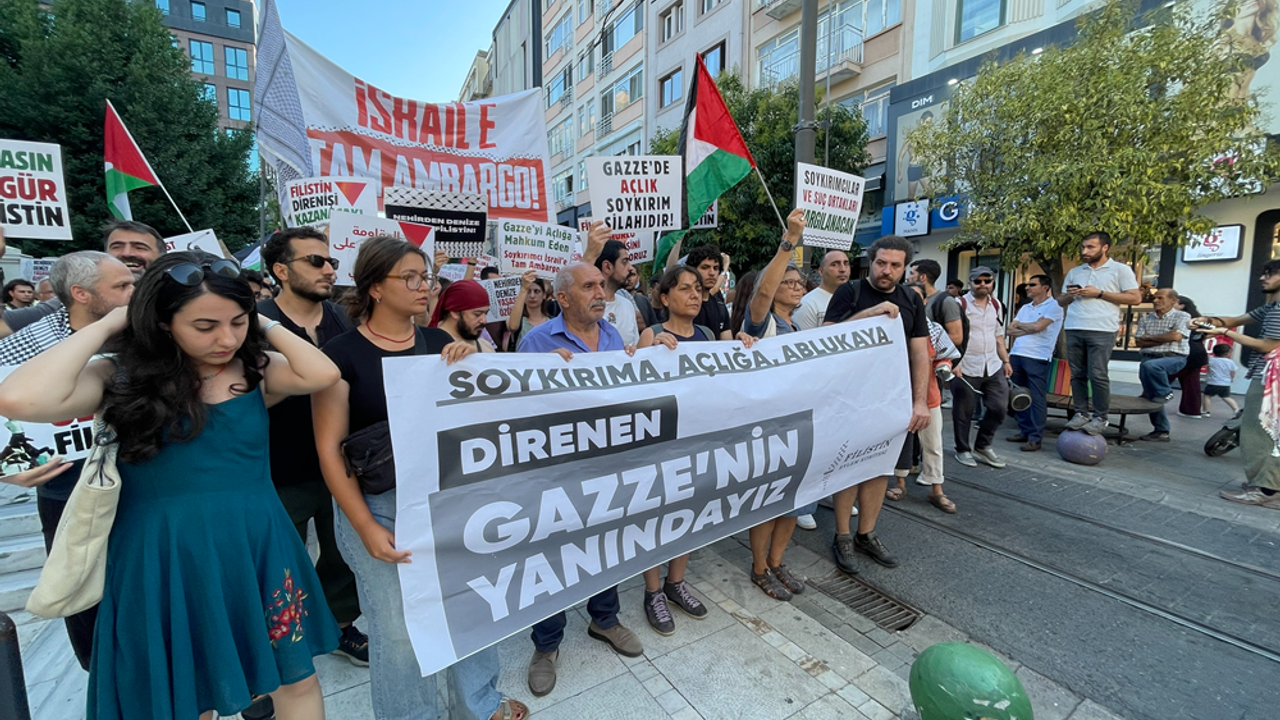 كاديكوي’دكي اييلمده إیسه “سويكيريمه اچليگه ابلوكايه ديرنن كازز’نين يانينداييز” يازيلي پانكارت اچان يورتاشلار، “نهيردن دڭزه وزكور فيليستين”، “كاهرولسون سييونيست إیسرايل دولتي”، “سويكيريمي إیزلمه تام امباركو اويكولا” ، “كازز’ده چوجوكلار اچليكتان ولويور” سلوكانلاري اتيلار.