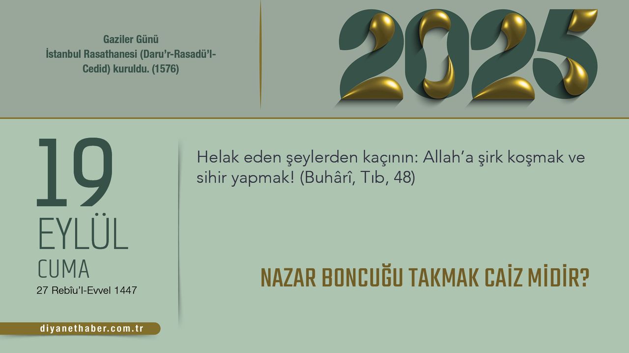 نازارين ماهييتي و كايفييتي كسين اولاراك بيلينممكله برابر، بازي كيمسلرين باكيشلارييله اولومسوز ايتكيلر مايدانه كتيربيلديكلري دينن ده كابول ايديلمكتدير. بير هاديس-ي شريفت، “(نازاردان) الل’ه سيگينين، چونكی نازار (كوز دگمسي) هاكتير.” (يبن ما، تيب، ٣٢) بويرولماكتادير. دينيميزده نيهاي ايتكييي الل’تان باشكاسينه اتفدن توتوم، داورانيش و إینانيشلار ياساكلانميشتير. بی سبپله نازار بونجوگی و ‏بڭزري شايلرين، بونلاردان مدت اوماك اماجييله بويونه وايه هرهانكي بير يره تاكيلماسي جايز دگلدير. نازاردان كورونماك إیچين بويله هورافلري ترك ايديپ هز. پايكامبر’ين تاوسييه ايتيگي ايت’ل-كورسي إیله إیهلاس و مواوويزتاين (فلاك، ناس) سورلري (بوهاري، تيب، ٣٢-٣٨); ايريجه اونون تورونلارينه ياپتيگي شی دوه اوكونماليدير: “هر تورلی شايتان و زهيرلي هاشراتان و بوتون كم كوزلردن الل’ين ايكسيكسيز كلمەلرينه سيگينيريم.” (بوهاري، ايهاديسو’ل-نبييه ١٠) نازار كونوسونده هز. پايكامبر’ين بی تاوسييلريني اويكولاديكتان سونره سونوجی يوجه الل’تان بكلمك إیسلام إینانجينين كرگيدير.